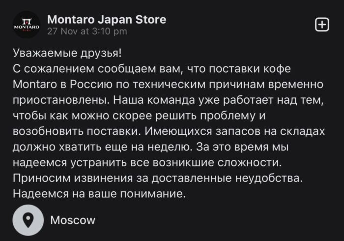 Поставщик японского кофе «Montaro» в Россию в социальных сетях сообщил о приостановке поставок напитка в нашу страну. Заморозку поставок компания-поставщик объясняет «техническими причинами».
